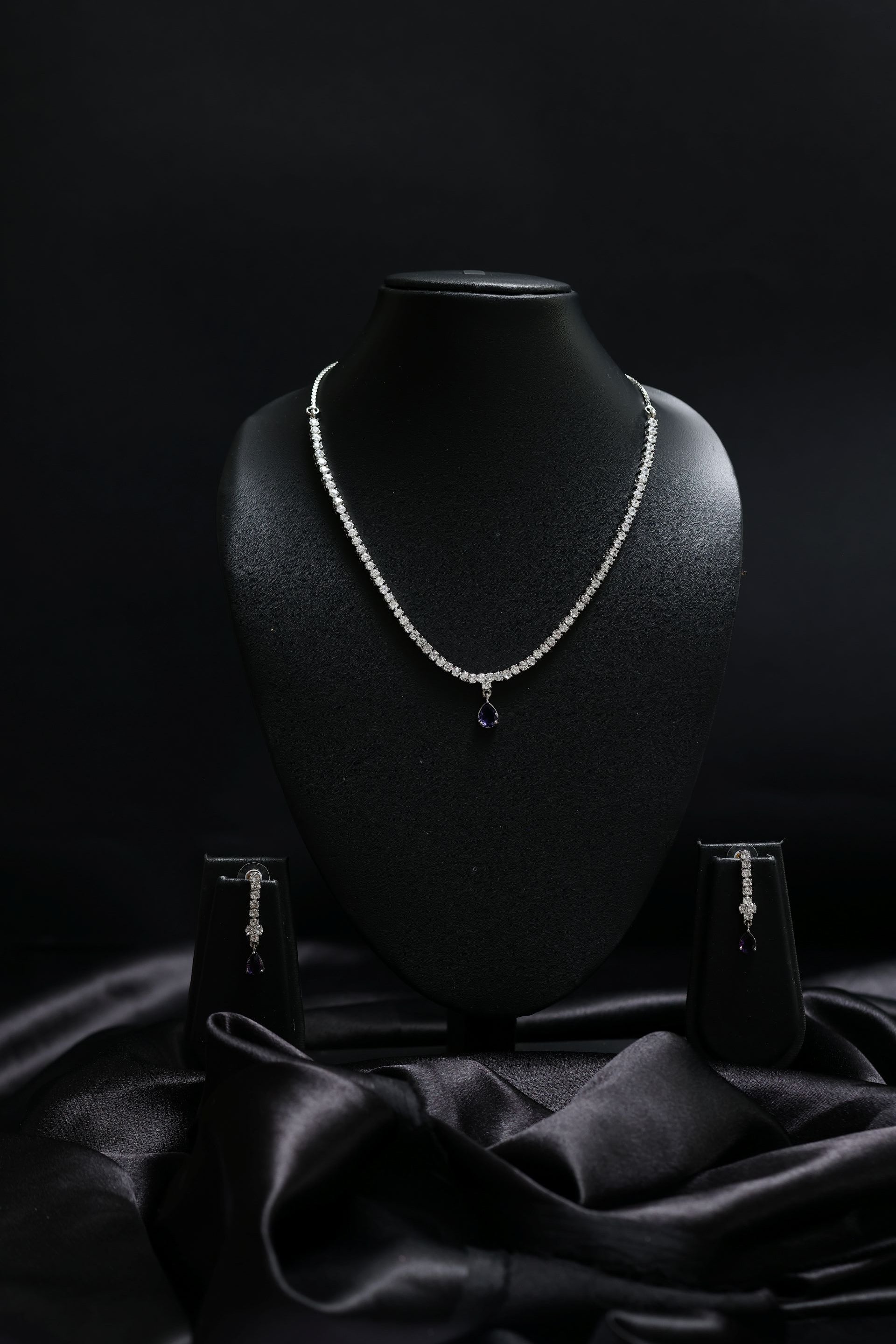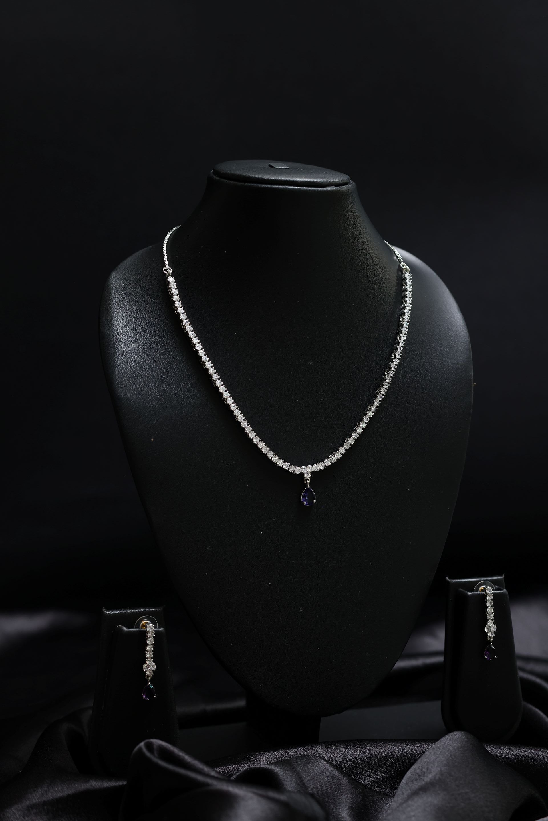 • Polish: Rhodium-Finished Silver • Stones: AAA+ CZ · Midnight-Blue Teardrop Crystal • Design: Minimal CZ Chain · Teardrop Centre Halo Pendant • Earrings: Matching CZ Drop Earrings with Teardrop Crystal • Closure: Secure Lobster Clasp • Occasion: Cocktail · Dinner · Office Party · Festive · Elegant Everyday Wear